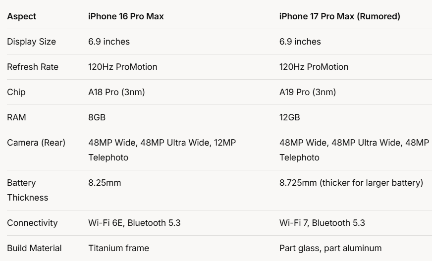 To provide context, here’s a table comparing rumored specs with the iPhone 16 Pro Max, based on available information: