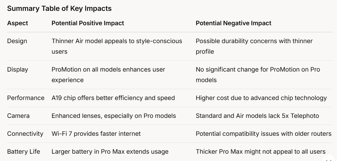- Positive Impacts: The thinner design and new display sizes offer more choices for consumers, while ProMotion on all models could democratize high-refresh-rate displays. Improved camera systems, especially on Pro models, might attract photography enthusiasts, and the larger battery in the Pro Max could appeal to power users. Wi-Fi 7 and faster charging could enhance connectivity and convenience.
